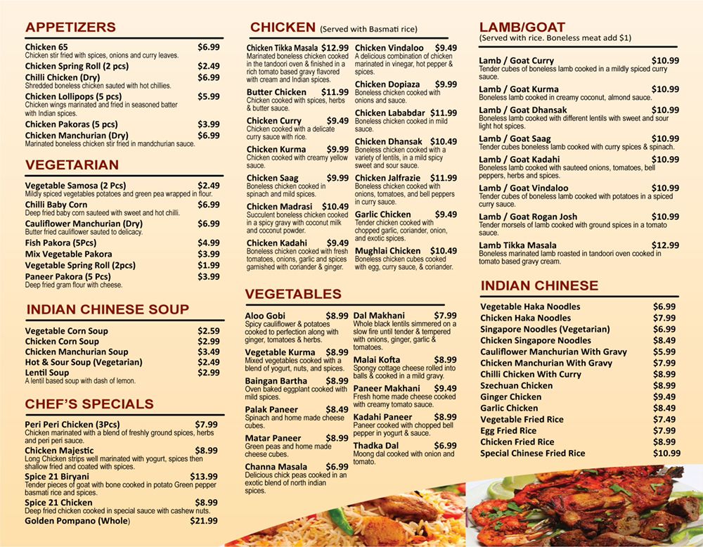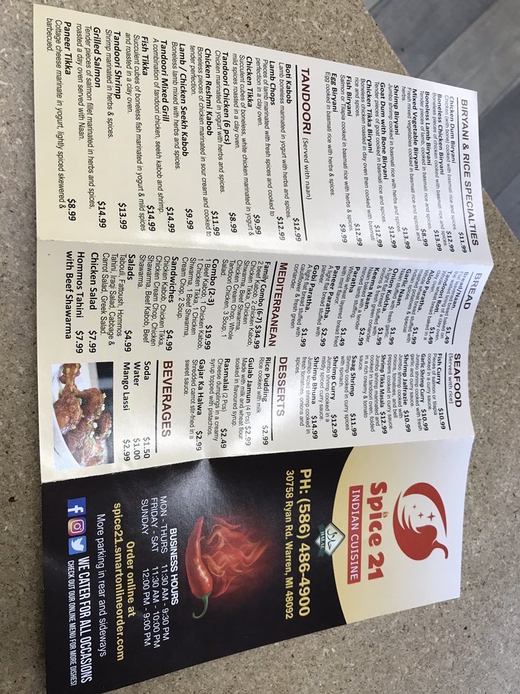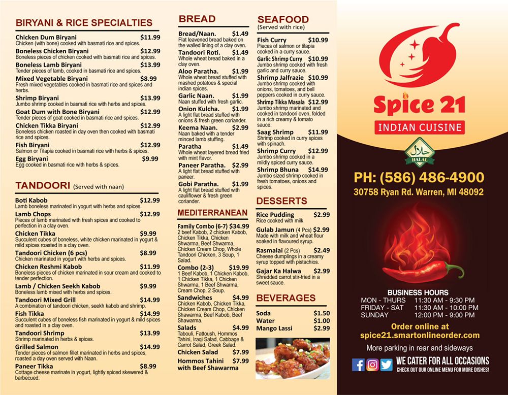 Welcome to Spice 21, your destination for an exquisite blend of seafood and decadent desserts located in Warren, MI. This innovative eatery offers an incredible menu that features mouthwatering dishes such as Boti Kabob and Chicken Reshmi Kebab, expertly marinated and roasted to perfection. Their appetizers, like the fan-favorite Chicken 65, are well-spiced and sure to ignite your palate.